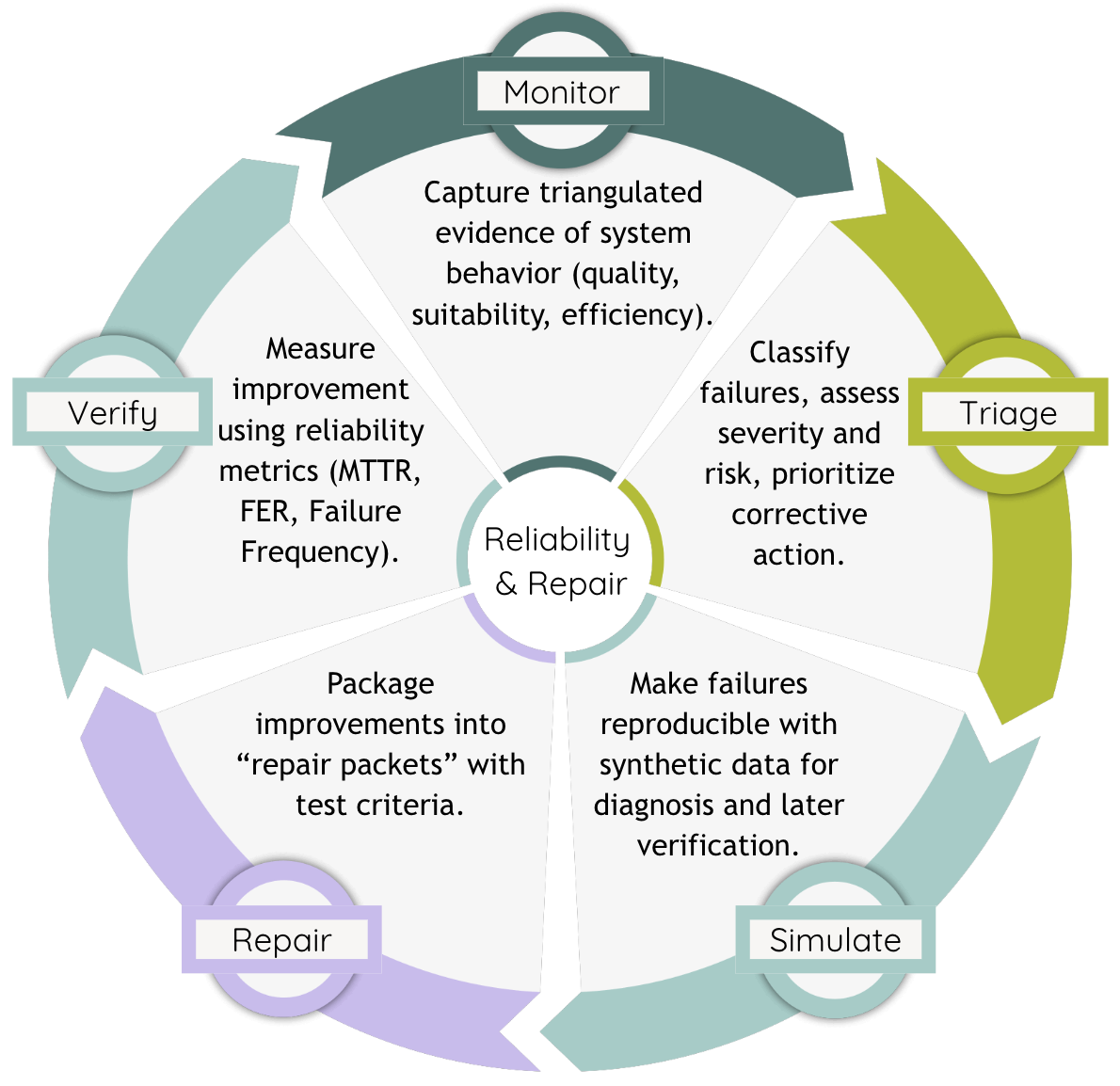 Artificial intelligence is moving from experimental pilots to embedded infrastructure across regulated domains such as audit, finance, and professional services. As these systems begin to make or influence decisions that carry strategic, financial, and reputational risk, their reliability can no longer be assured by static validation alone. This white paper presents a framework for Reliability & Repair: a structured, repeatable process for detecting, triaging, simulating, repairing, and verifying failures in complex AI systems. By combining established reliability-engineering practices with modern AI monitoring techniques, it demonstrates how organizations can measure reliability growth, align risk with severity, and transition from passive oversight to continuous improvement.