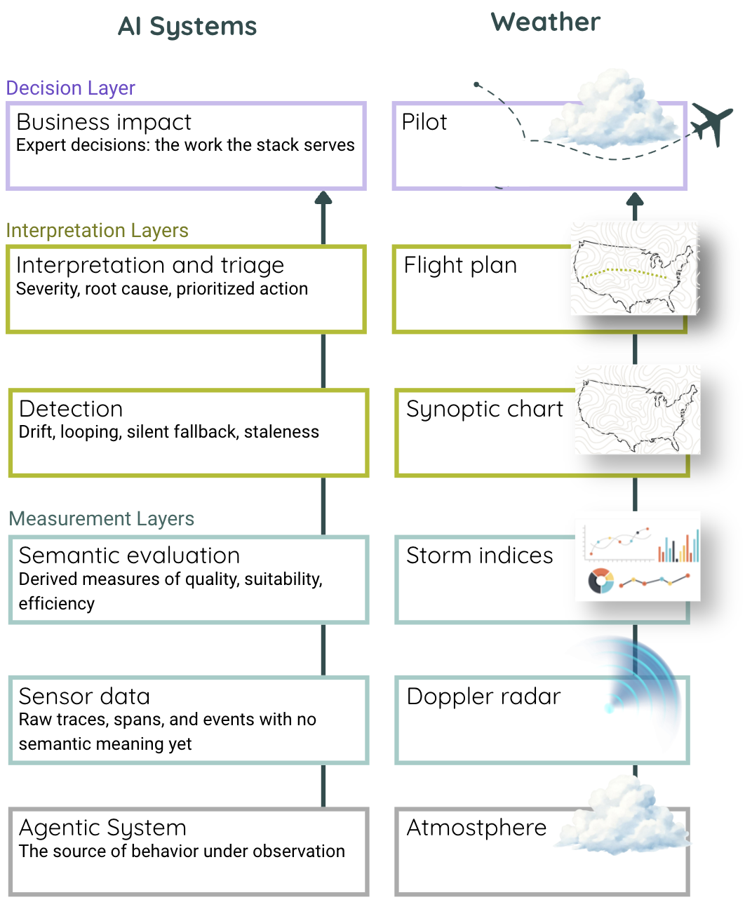 Sensor data. The bottom of the stack is the raw feed: traces, spans, tool calls, retrieval events, token counts, timing data, structured logs from whatever the agent did. In a well-instrumented agentic system, this layer is dense, because every step the system took leaves a trace, and every trace carries enough metadata to reconstruct what happened. But a trace is not an answer, and a complete log of every step an agent took does not tell you whether the work reached its destination. It tells you what the system did, not what the work required. This is Doppler radar. Radar returns show where the water vapor is and how it's moving, but that is not the same as knowing whether a storm is forming, and a pilot reading raw radar cannot yet plan a flight. The sensor layer is necessary, precise, and insufficient on its own.